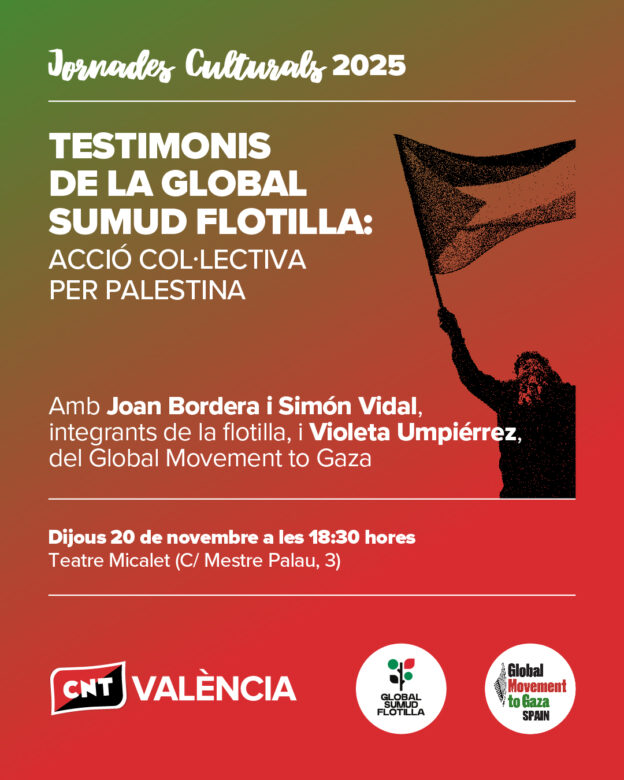 Des de CNT València organitzem una nova edició de les nostres Jornades Culturals amb l’objectiu de convidar a la reflexió, la solidaritat i l’acció col·lectiva. Enguany, les jornades posen el focus en la resistència del poble palestí i en la necessitat de repensar les emocions polítiques que mouen la transformació social.