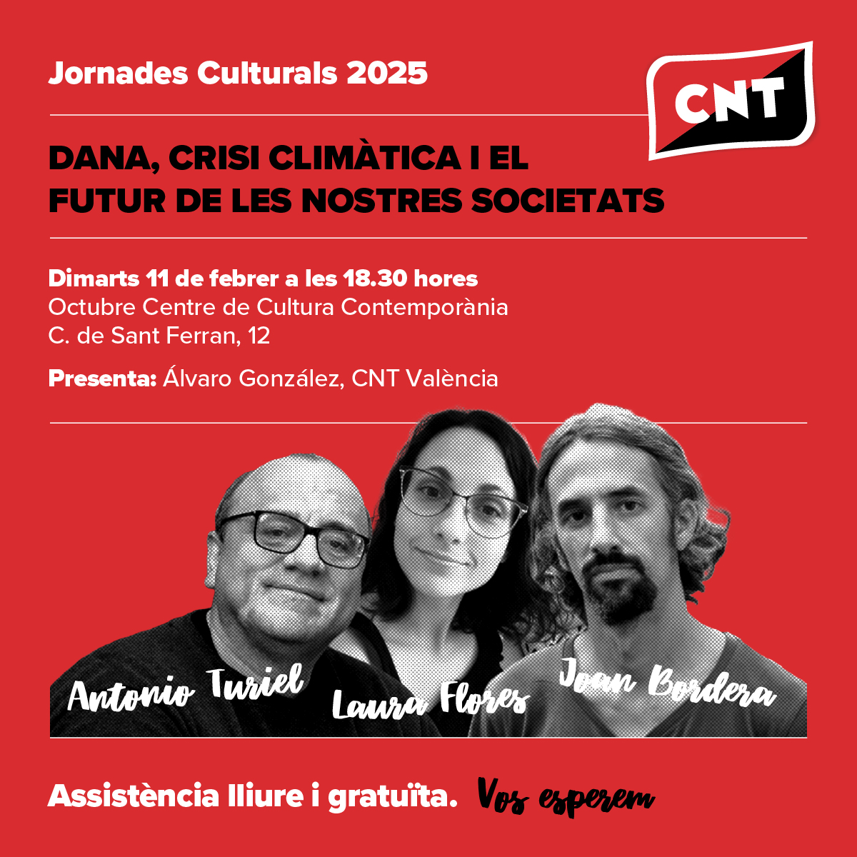 Per part seua, baix el nom “DANA, crisi climàtica i el futur de les nostres societats”, la segona cita serà un diàleg entre Antonio Turiel i Laura Flores, referents de la ciència i la divulgació, juntament amb el periodista Juan Bordera, que moderarà el nostre company de sindicat Álvaro González.