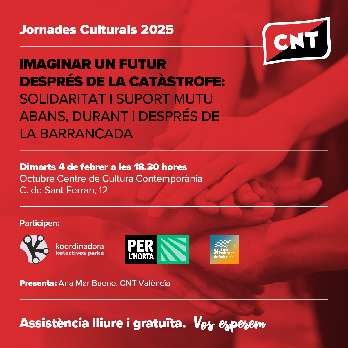 Des de CNT València hem impulsat unes Jornades Culturals Extraordinàries per a iniciar 2025. Com sempre, la nostra intenció és generar un espai per a abordar diferents qüestions que ens travessen com a societat des de l’intercanvi de coneixement i la reflexió. En aquesta ocasió, hem considerat oportú dedicar-les a la DANA, analitzant la gestió i el seu context climàtic-social.